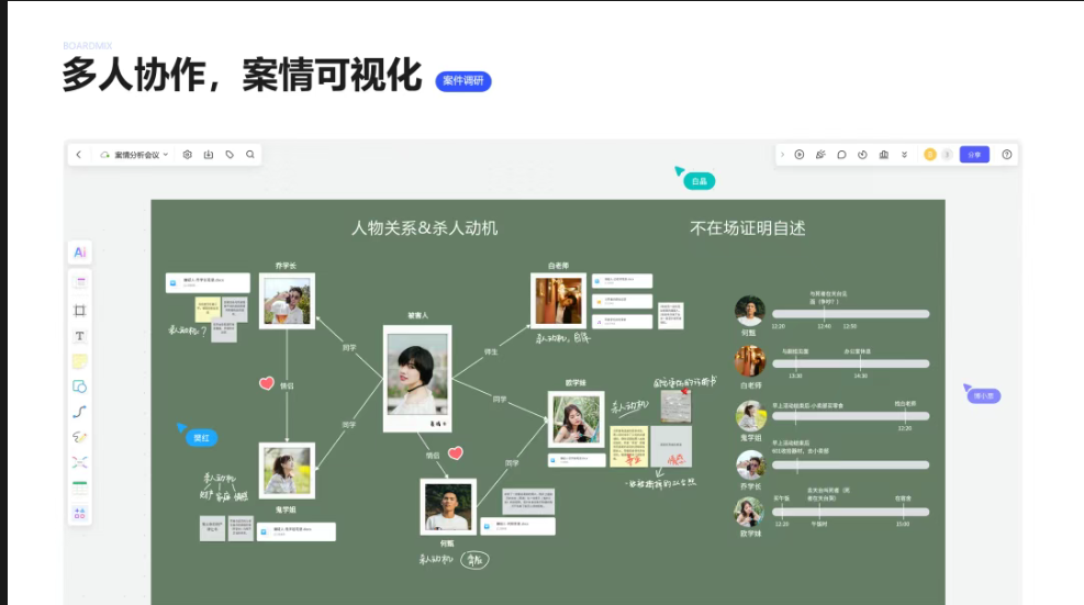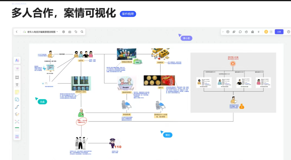 boardmix为缉私人员提供了一个无限大的数字协作空间。在这个空间内,办案人员可以打破传统文档的线性限制,将案件中的人物关系、时间线索、物证信息等要素,以思维导图、流程图、人物关系图等多种形式进行可视化整理和呈现。这种“一图胜千言”的表达方式,提高了案情分析的直观性和准确性。