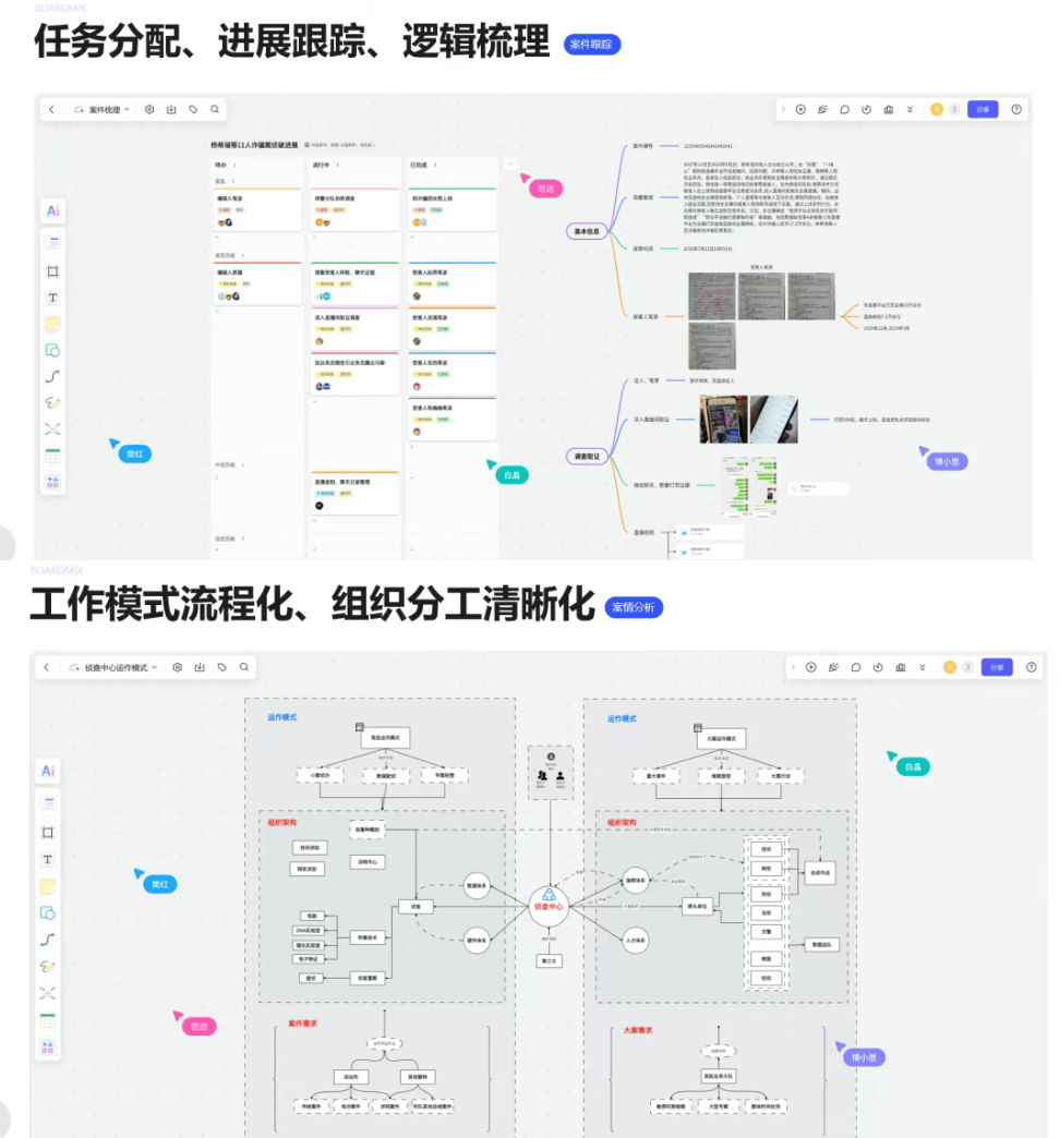 与此同时,通过boardmix的看板功能,可以清晰地进行任务分配、制定流程和进展跟踪,实现对整个案件侦办过程的精细化管理。