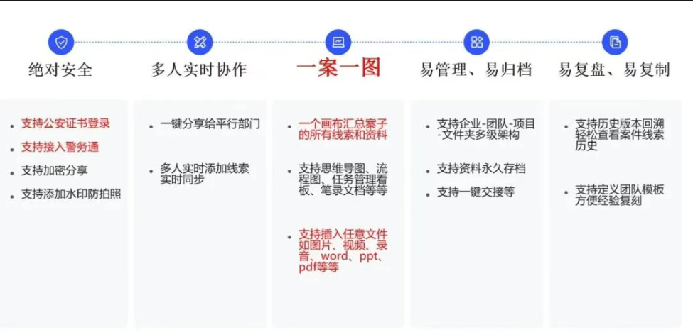 在传统缉私办案流程中,案件证据繁杂、人物关系错综复杂,常常涉及文字、图片、视频等多种形式的证据。办案人员往往依赖物理白板或单机软件进行案情分析,不仅难以实现多人在线协同,证据逻辑也无法清晰呈现,案件资料分散难以归档,严重制约了办案效率。