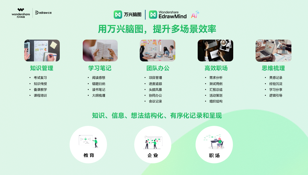 万兴脑图(原亿图脑图)创意软件为A股上市公司万兴科技旗下产品,支持文件多端同步,AI+思维导图+笔记结合,全面提升工作学习效率。