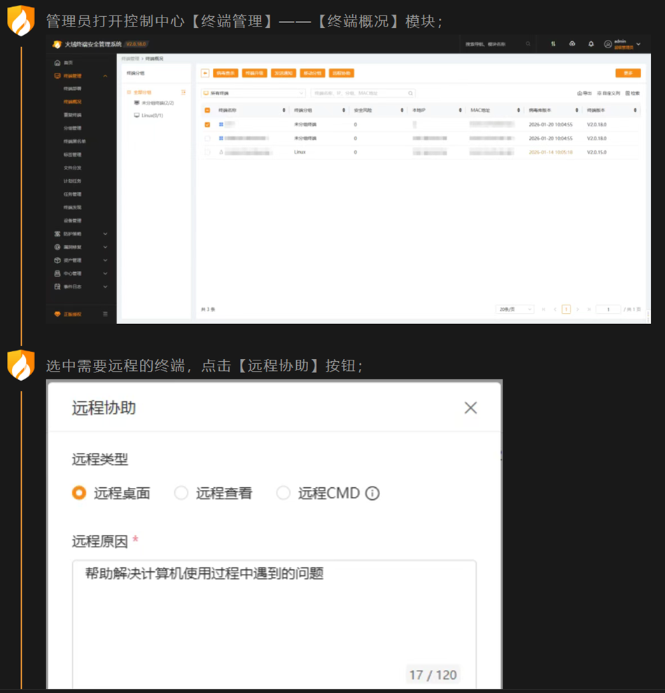 火绒终端安全管理系统远程协助功能火绒终端安全管理系统远程协助功能核心是管理员通过控制中心远程操控终端,线上解决电脑设置、病毒查杀、系统故障等问题,无需现场排查。该功能相较普通工具有集成于安全管理系统,支持内网使用,无需开启3389等高危端口,规避入侵风险等的优势。