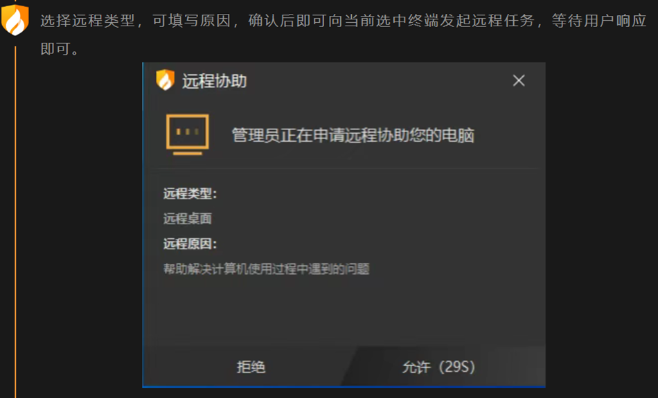 选择远程类型,可填写原因,确认后即可向当前选中终端发起远程任务,等待用户响应即可。